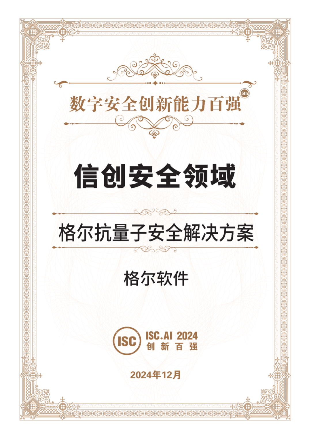 近日,ISC.AI创新技术论坛暨ISC.AI 2024 创新能力百强颁奖典礼在北京圆满落幕。格尔软件的创新成果“格尔抗量子安全解决方案”荣获信创安全领域“创新百强”奖项。