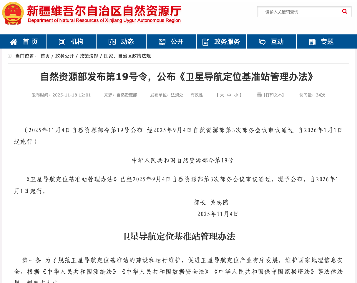 2025年11月18日,自然资源部正式发布《卫星导航定位基准站管理办法》(以下简称《办法》),明确自2026年1月1日起施行。作为规范卫星导航定位基准站建设、运行与数据安全的核心规章,《办法》首次将“商用密码保护”纳入观测数据传输的强制要求,同时围绕数据全流程安全、涉密管理等维度划定刚性标准——这不仅为国家地理信息安全筑牢防线,更让商用密码技术在基准站领域的应用迎来“刚需窗口期”。