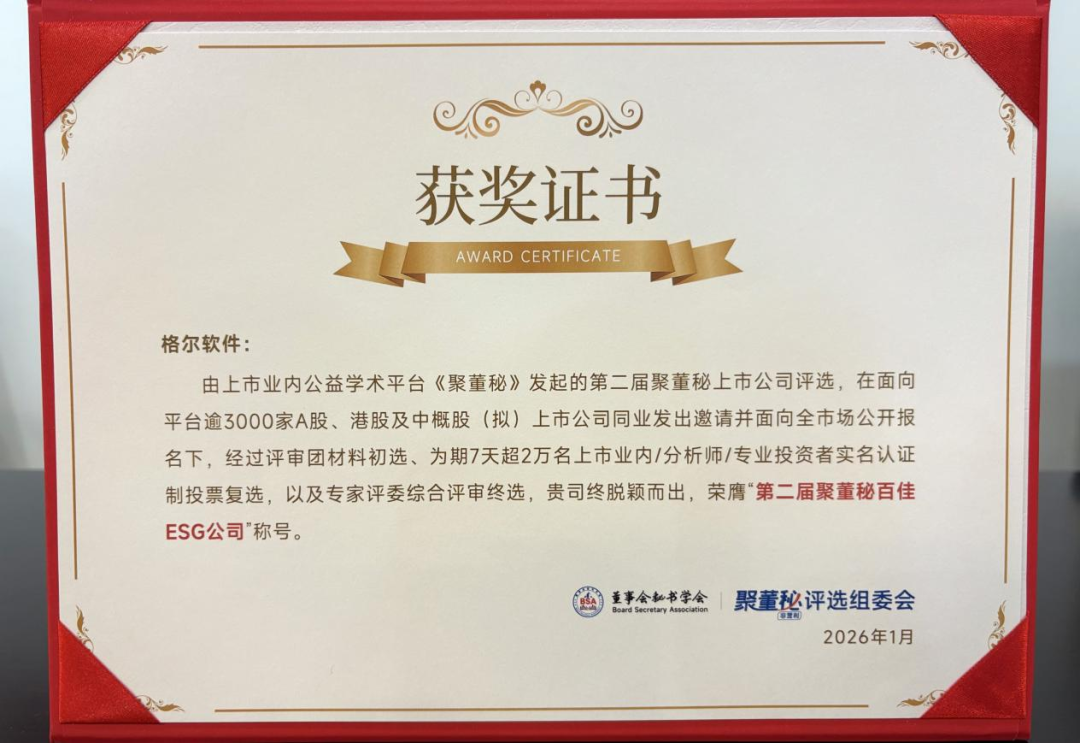 2026年1月10日,中国最大的上市公司社区聚董秘正式发布“第二届聚董秘上市公司”评选结果。格尔软件凭借卓越的综合治理水平与可持续发展成果,在此次评选中一举荣获“百佳ESG公司”“百佳CFO”“百佳董秘”及“百佳证代”四大奖项。本次四项殊荣,不仅体现了公司在财务治理、可持续发展、信息披露与投资者关系等全方位的卓越表现,也彰显了资本市场对公司综合实力的高度认可。