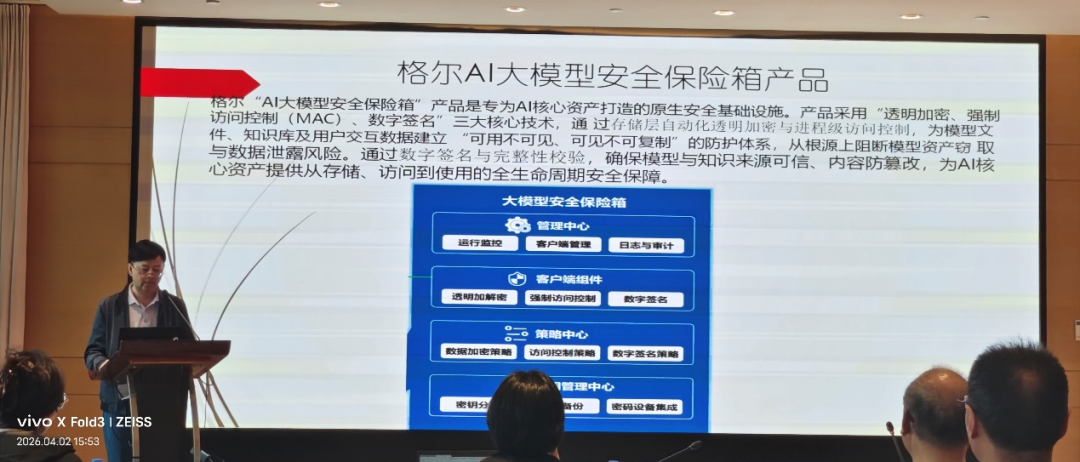 在专题研讨期间,格尔软件向国家密码管理局领导、网络安全标准化专家及各企业代表,重点发布了格尔AI大模型安全保险箱。该产品是格尔软件专为AI核心资产打造的原生安全基座。通过深度融合操作系统内核级防护技术与现代密码学算法,为模型权重、训练数据、知识库等关键资产,提供覆盖存储、访问、使用过程的安全保护。